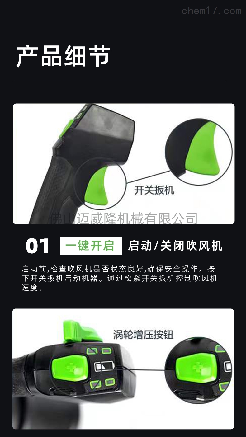 產(chǎn)品特點(diǎn):glebe 80V背包式吹風(fēng)機(jī):低噪音、渦輪增壓、巡航控制、靈活輕便、耐久性長(zhǎng)、能耗低。輕便靈活,便于攜帶,一年保修,免費(fèi)計(jì)費(fèi),鋰電池設(shè)計(jì),壽命長(zhǎng),一鍵啟動(dòng),無(wú)刷電機(jī),功率強(qiáng)勁。一鍵啟動(dòng),風(fēng)速高,簡(jiǎn)單方便,風(fēng)量大,鋰電池,渦輪充電,噪音低,無(wú)需加油。操作簡(jiǎn)單、輕便、性能穩(wěn)定、散熱快、質(zhì)量可靠、值得信賴、維護(hù)成本低。無(wú)刷電機(jī),啟動(dòng)方便,風(fēng)量可調(diào),靠背舒適,使用安全。它適用于各種場(chǎng)景:在道路上吹碎石,在溫室里吹雪,在物業(yè)社區(qū)吹落葉,森林滅火,風(fēng)力滅火。