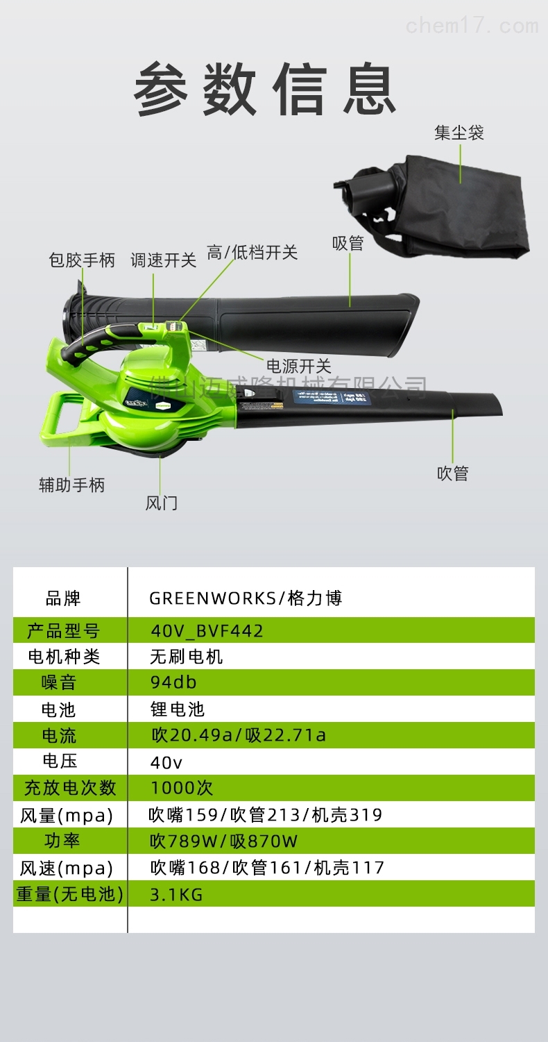 Glebe 40V bvf442便攜式鋰電池吹吸機(jī)產(chǎn)品參數(shù):品牌:greenworks/Glebe產(chǎn)品型號(hào):40V_bvf442電機(jī)類型:無(wú)刷電機(jī)噪音:94db電池:鋰電池電流:吹20.49a/吸收22.71a電壓:40V充放電次數(shù):1000倍重量(無(wú)電池):3.1kg功率:吹789w/吸收870w風(fēng)速(MPA):吹噴嘴168/吹管161/殼體177風(fēng)量(MPA):吹管159/吹管213/殼體319