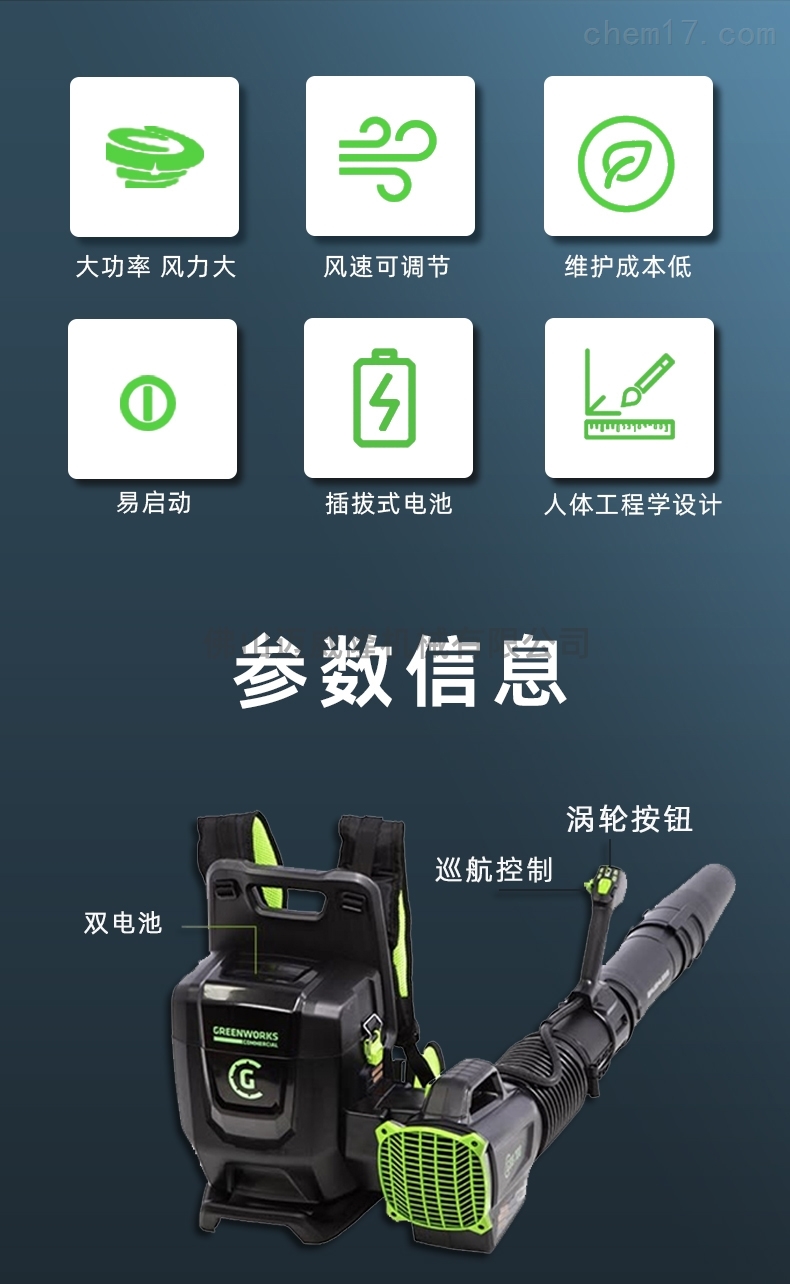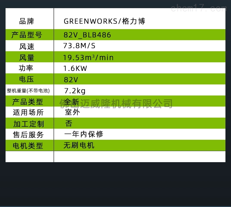 Glibo 82v blb486雙電池吹風(fēng)機(jī)產(chǎn)品參數(shù):品牌:greenworks/Glibo產(chǎn)品型號(hào):82v_blb486風(fēng)速:73.8m/s風(fēng)量:19.53m3/min功率:1.6kw電壓:82v整機(jī)重量(無(wú)電池):7.2kg產(chǎn)品類(lèi)型:全新適用場(chǎng)所:戶外加工定制:無(wú)售后服務(wù):一年內(nèi)保修電機(jī)類(lèi)型:無(wú)刷電機(jī)